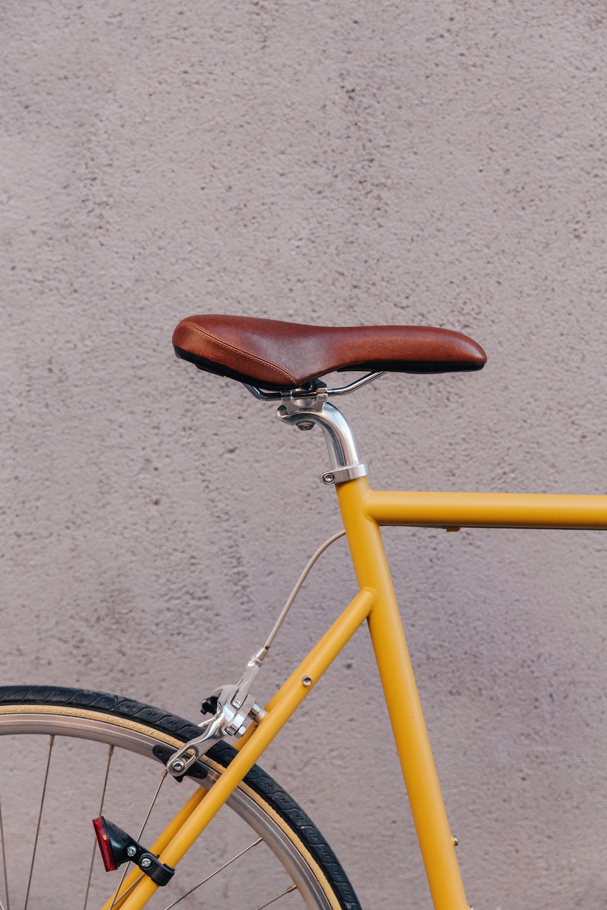 Bereifung Details: Klassischer, geschwungener Lenker mit braunen Griffen und Sattel